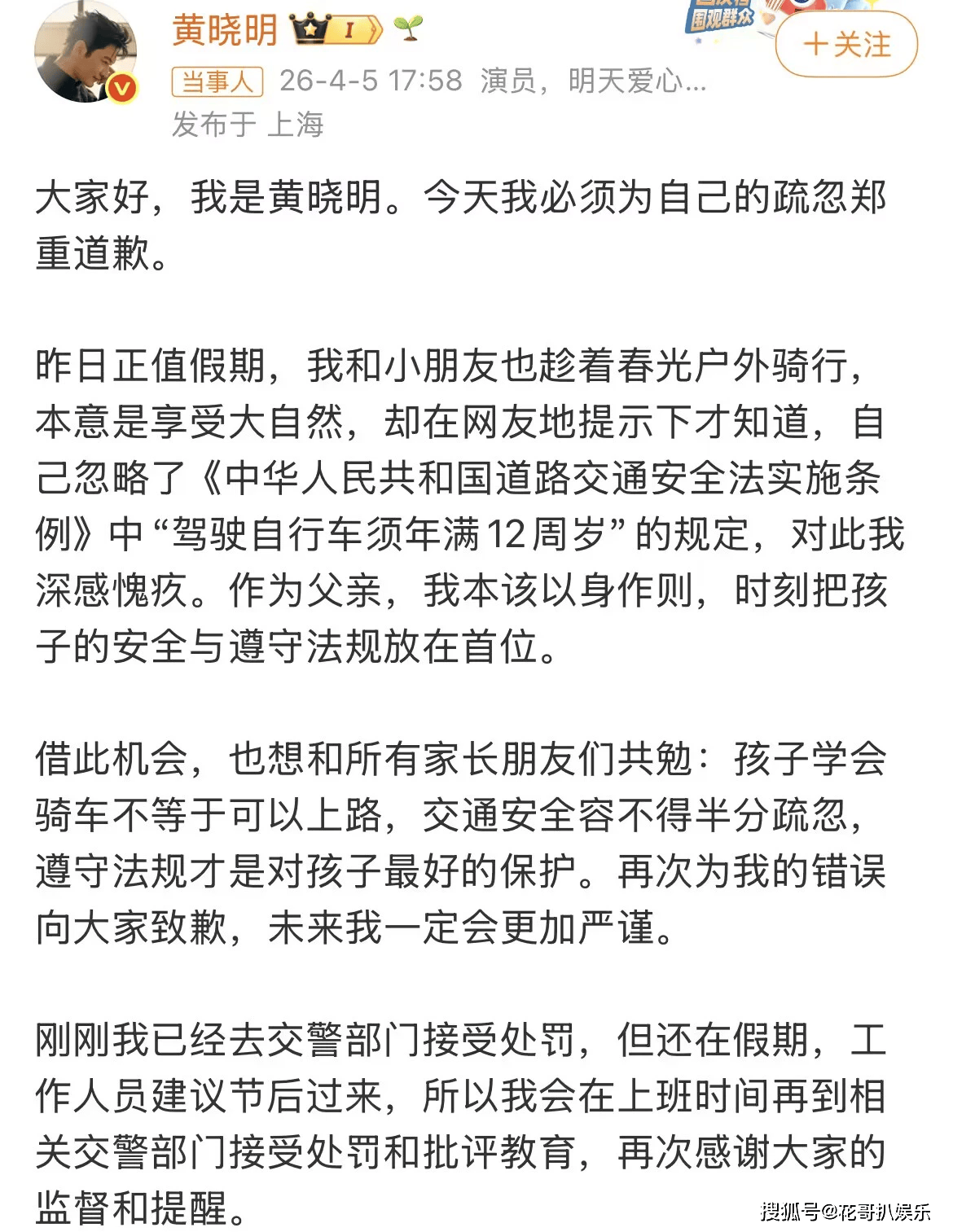 舆论发酵之后,黄晓明的反应也算迅速,第一时间删除了原本晒出的合照,紧接着专门发布道歉声明,表示自己已经深刻意识到问题,并且主动前往相关部门咨询对应的处理方式,态度看上去十分诚恳。很多网友看到这里都表示,虽然行为不妥,但知错能改也算有担当,没必要一直揪着不放。毕竟虽然规定是规定,但现实生活中很多不满12周岁的小孩都会骑车上路。