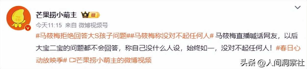 最近马筱梅本身就处在舆论风口,4月23日,她在直播中直接表态,以后关于大宝二宝的问题,一概不回答,还强调自己“没对不起任何人”。