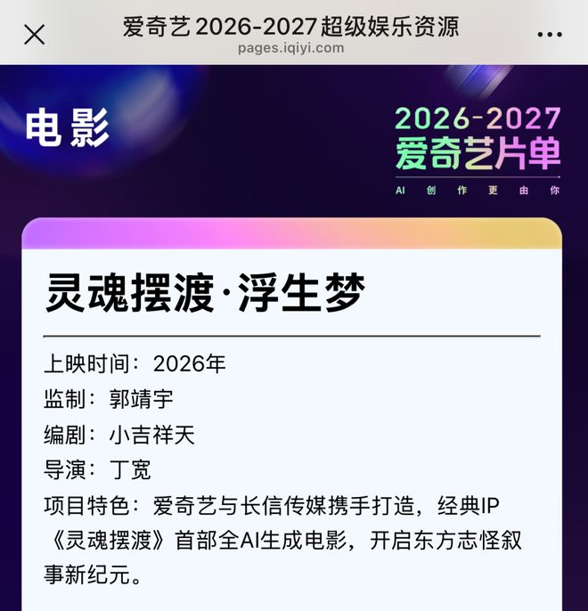 近日,爱奇艺公布2026-2027片单,官宣爱奇艺与长信传媒携手打造的首部全AI生成电影《灵魂摆渡·浮生梦》已在开发中,将于2026年内上映。
