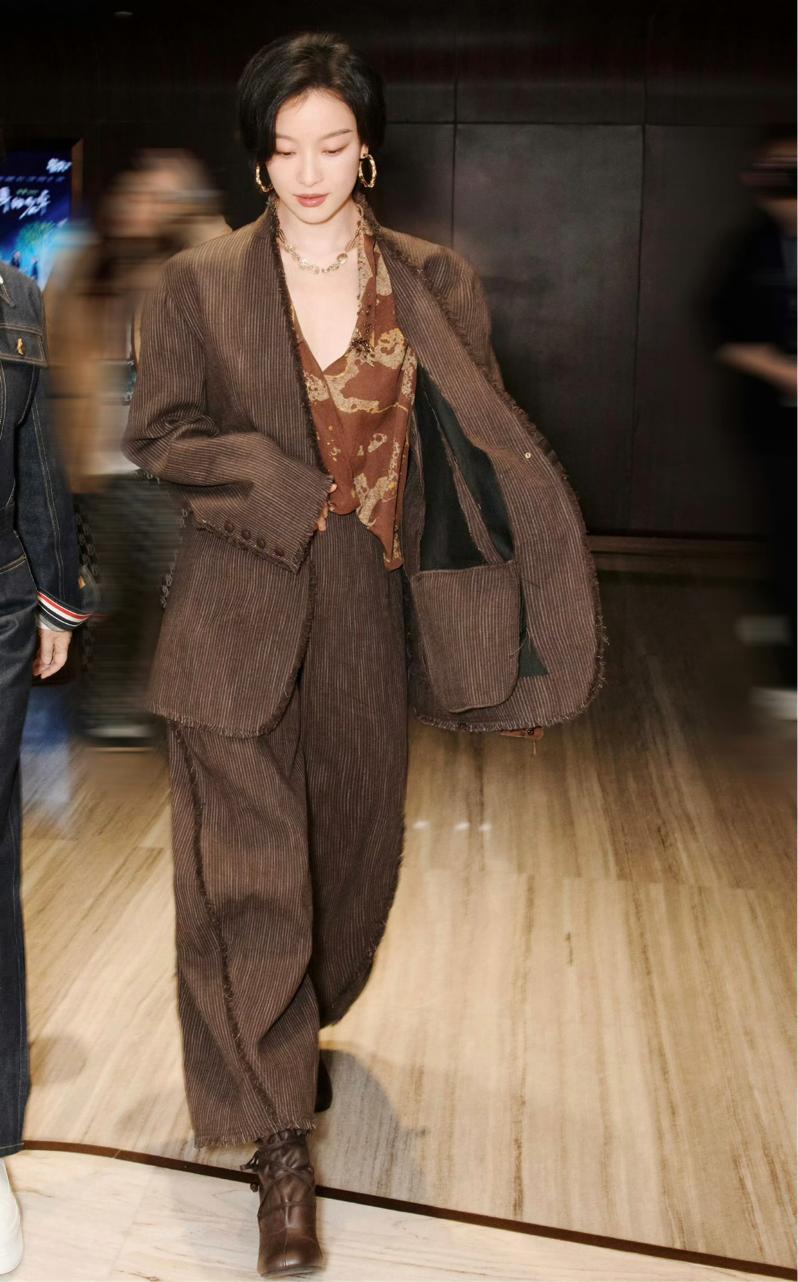 收成设计的工装风外套,腰线一收,立马分割出黄金比例,“九头身”在此刻彻底具象化,即便是宽大的阔腿裤,也完全不会显臃肿。