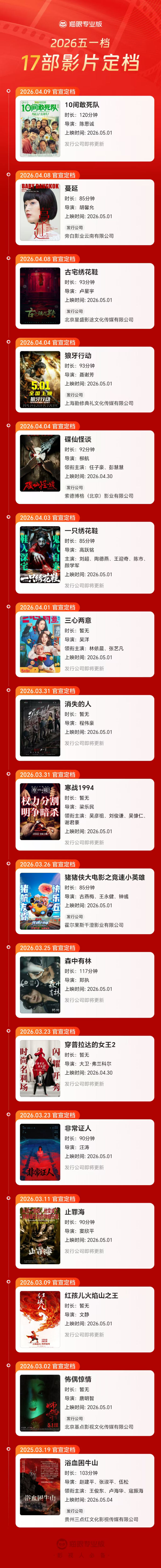 4月9日,由陈思诚编剧、导演的喜剧新作《10间敢死队》正式官宣定档5月1日全国上映。随着这部备受关注的影片加入战局,据猫眼专业版上映日历显示,截至当前,2026年五一档已定档影片达到17部。