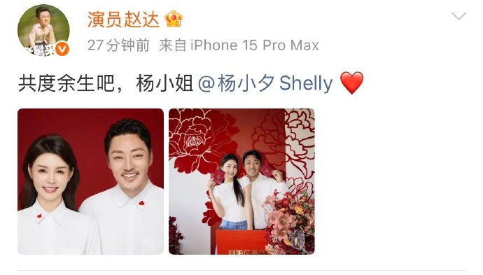 演员赵达与圈外女友杨小夕于2026年4月11日以一句“共度余生吧”的简洁告白官宣婚讯,两人同步晒出红底结婚照,低调温馨的举动不仅收获全网祝福,更引来董璇、周也等明星好友的真诚道贺。