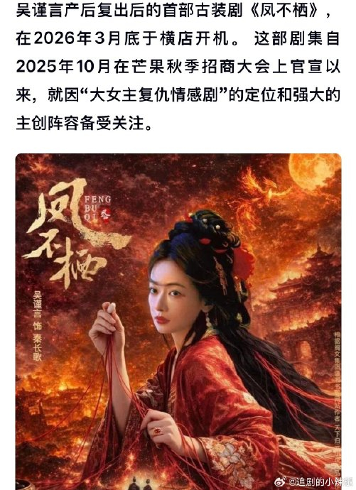 ## 鸣叫阵阵,凤舞风起:《凤不栖》开机,吴谨言魏哲鸣演绎帝后相爱相杀的宛如痴迷,“凤不栖”开机,浙江横店 becomes 一片熙熙攘攘的古装剧迷场,吴谨言、魏哲鸣主演的这部改编自天下归元小说《帝凰》的权谋大剧,今天在横店正式开机,瞬间点燃了粉丝们的热情。,这部剧聚焦“帝后重生复仇”的故事,讲述千绝门弟子秦长歌为平息战乱将“帝星之力”赠予西梁皇子萧玦,两人携手平定乱世后,秦长歌却遭背叛焚身而死,三年后她重生归来,以宫女身份重返皇宫追查真相,与萧玦陷入相爱相杀的命运轮回,剧中融合权谋、复仇与女性成长,女主从“天命附庸”蜕变为“天命本身”,高能情节层层叠叠,令人欲罢不能。,作为这部剧的女主,吴谨言再次挑战复仇大女主角色,她凭借《延禧攻略》《墨雨云间》的精彩演技,这次更是将“凌厉”演技发挥得淋漓尽致,魏哲鸣则在剧中饰演“温润帝王→疯批夫君”,这一角色复杂的演变需要魏哲鸣精准的把握,相信他会将这份挑战化为另一个精彩的演技里程碑。,开机现场粉丝们用“长歌新启·凤鸣九天”为主题的花墙,呼应剧中女主秦长歌的命运,场面感人至深,导演郭虎、编剧团队、美术设计王一凡、造型师方思哲等一众重量级制作班底的加持下,这部剧不仅在情感张力上有保证,更在视觉呈现上将上一层楼,无论是服装造型还是场景设计,都将为观众带来一场视听与心灵的双重盛宴。,观众们对这部剧充满期待,尤其是吴谨言和魏哲鸣的搭档,无论是“凤”与“兽”的天生一对,还是“长歌”与“萧玦”的爱恨纠葛,都让人直观感受到剧中情感的澎湃与复杂,相信这部剧会在古装剧的天空中留下一道亮丽的印记,成为2026年春季最值得期待的剧作之一。**《凤不栖》开机,吴谨言魏哲鸣携手演绎帝后相爱相杀,备受期待!**,吴谨言、魏哲鸣联袂主演的古装剧《凤不栖》在浙江横店正式开机,聚焦“帝后重生复仇”的权谋故事,备受粉丝和影视爱好者关注,本文将从多个角度为这部剧撰写一篇500-100字的吃瓜简评。,---,### 一、开机现场与主创阵容,开机仪式圆满举行,多位网友发布路透照显示主演吴谨言、魏哲鸣亲临现场,粉丝们纷纷聚集在花墙前,用“长歌新启·凤鸣九天”为主题,表达对女主秦长歌命运的支持,导演郭虎(代表作《莲花楼》)亲临指导,编剧团队包括夏梦莹、彭媛等人,整体阵容强大,备受期待。,---,### 二、剧情与制作背景,《凤不栖》改编自天下归元小说《帝凰》,讲述千绝门弟子秦长歌为平息战乱将“帝星之力”赠予西梁皇子萧玦,二人携手平定乱世,秦长歌却遭到背叛,焚身而死,三年后,她重生归来,以宫女身份重返皇宫,与萧玦陷入相爱相杀的命运轮回。,---,### 三、演员适配性与观众期待,**角色契合度:** ,吴谨言近年来多次出演复仇型大女主,如《延禧攻略》《墨雨云间》,此次饰演秦长歌,凌厉的气场与复仇情节高度契合,魏哲鸣则挑战“温润帝王→疯批夫君”的复杂角色,展现多面演技,网友普遍认为两人搭档“意外很搭”。,**制作班底加持:** ,导演郭虎擅长处理宏大叙事与情感张力,《莲花楼》等作品印证了他的实力,美术设计王一凡、造型师方思哲加盟,强化剧集的视觉质感,期待剧中场景与服装设计令人惊艳。,---,### 四、剧情亮点与观众期待,**高能情节:** ,剧中涉及剜目焚身、重生逆袭等高能情节,凸显女主的复仇决心与成长轨迹,权谋与复仇并存,剧情紧凑,令人屏息。,**制作周期:** ,拍摄周期约100天,节奏紧凑,剧组经验丰富,预计能高质量完成拍摄。,---,### 五、补充说明,本次开机延期至4月,原本计划3月底开机,因筹备调整而推迟,尽管有阵容变动传闻,但最终以官方公布名单为准,吴谨言、魏哲鸣稳定出演,粉丝期待值拉满。,---,### 《凤不栖》凭借强大的演员阵容、精心打造的剧情以及高水平的制作班底,成为备受期待的剧集,无论是吴谨言的凌厉演技,还是魏哲鸣的角色转变,都值得期待,期待这部剧开启一波高能权谋风暴!