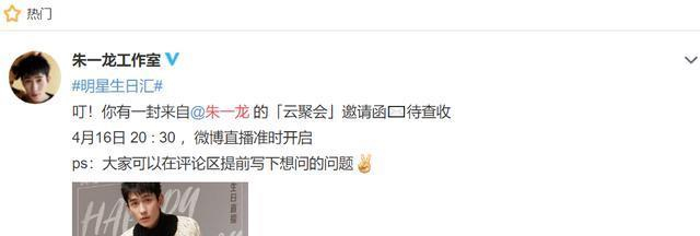 庆祝33岁生日,朱一龙时隔数月重返直播间,有两重大礼等待小笼包解锁!粉丝不只能够看到“新鲜”的朱一龙,还能与偶像隔空互动,提出自己好奇的问题。朱一龙工作室写道:明星生日汇,您有一份朱一龙发来的“云聚会”邀请函等待查收,4月16日晚上8点30分,来看朱一龙的直播,大家可以在评论区提出自己想问的问题!