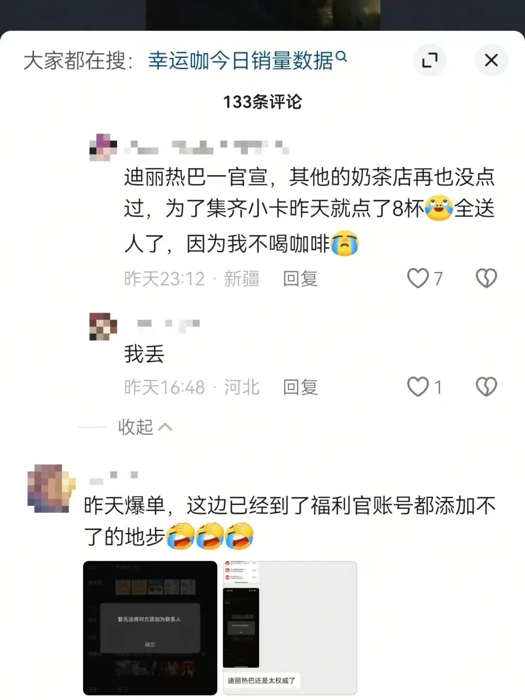 这两天,不少粉丝前去幸运咖门店打卡,带来大批流量与业绩。开门30分钟直接爆单,小票机不停出票,咖啡机被抡到冒烟,就连幸运咖的官方福利官账号都被挤爆到无法添加的地步……