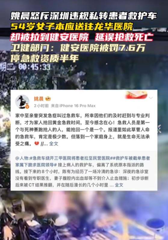 **“救护车改道,生命通道被践踏”——姚晨发声引发的公众愤怒与对急救体系的深度思考**,“姚晨发声”这四个字,在近日的网络舆论中掀起了一股热浪,犹如一滴石子激起的涟漪,这位演员以一段沉寂近八个月的悲剧为起点,重新点燃了公众对生命安全的关注,也撕开了急救体系管理中的一个深层黑暗。,这场悲剧始于2025年8月5日凌晨,54岁的张女士在剧痛中被惊醒,丈夫陈有为拨通了120,按照紧急情况处理流程,患者应被送往仅2.8公里外的公立三甲医院——龙华区人民医院,深圳市健安医院的救护车却“配上”了不同的目的地——3.8公里外的自家民营医院,这种“改道”不仅违反了120调度指令,更像是对生命通道的冷漠践踏。,当救护车偏离正确路线后,这位普通家庭的生活就彻底被改写,八小时的漫长黑夜里,张女士在健安医院的急诊室里失去了意识,未能得到及时的止血介入,在目标医院进行手术时,已经无法挽救她的人命,更令人发指的是,救护车的改道行为竟然被医院当局“默许”甚至“保护”,直到调查结果公布才被曝光。,2026年4月8日,深圳市卫健委的调查结果如同一盆冷水,将健安医院的行为定性为“恶劣、情节严重,破坏公共救援体系根基”,对其处以7.6万元罚款并暂停院前急救资质半年,但在公众和逝者家属看来,这种处罚似乎与行为的严重性相比,显得过于轻量,网友们纷纷质疑:“延误救治人命,直接导致生命延误,这等于谋杀!7.6万元的罚款,能否补偿一个家庭的痛苦??”,姚晨的发声,恰如一把火,点燃了公众对急救体系的深度思考,这不仅仅是一个简单的违规事件,而是对公共信任基础的严重侵蚀,当救护车不再是“就急、就能力”的最后防线,而是被医院利益驱动成“血盆教匠”,每一声“120”都可能成为生命安全的“Death Note”,这确实令人深思。,这场悲剧撕开了急救体系管理的伞幕,暴露了其中的腐败与失序,公众的愤怒与姚晨的诘问,共同构成了对生命尊严的维护,也对急救体系的管理提出了一系列尖锐问题:如何建立更加严密的监管机制?如何确保救护车始终以救死扶伤为本?这些问题的答案,不仅关系到每一个家庭的安全,更关系到整个社会的文明进程。,在这个人人都可能成为“深夜等待救援的普通人”的时代,我们对急救体系的信任,实在是太过可贵,而姚晨这一次发声,不仅是对一个家庭的追责,更是对整个社会的警示:生命通道不容亵渎,必须用最严格的监管与最严厉的惩处,守住那条绝不能失守的最后防线。