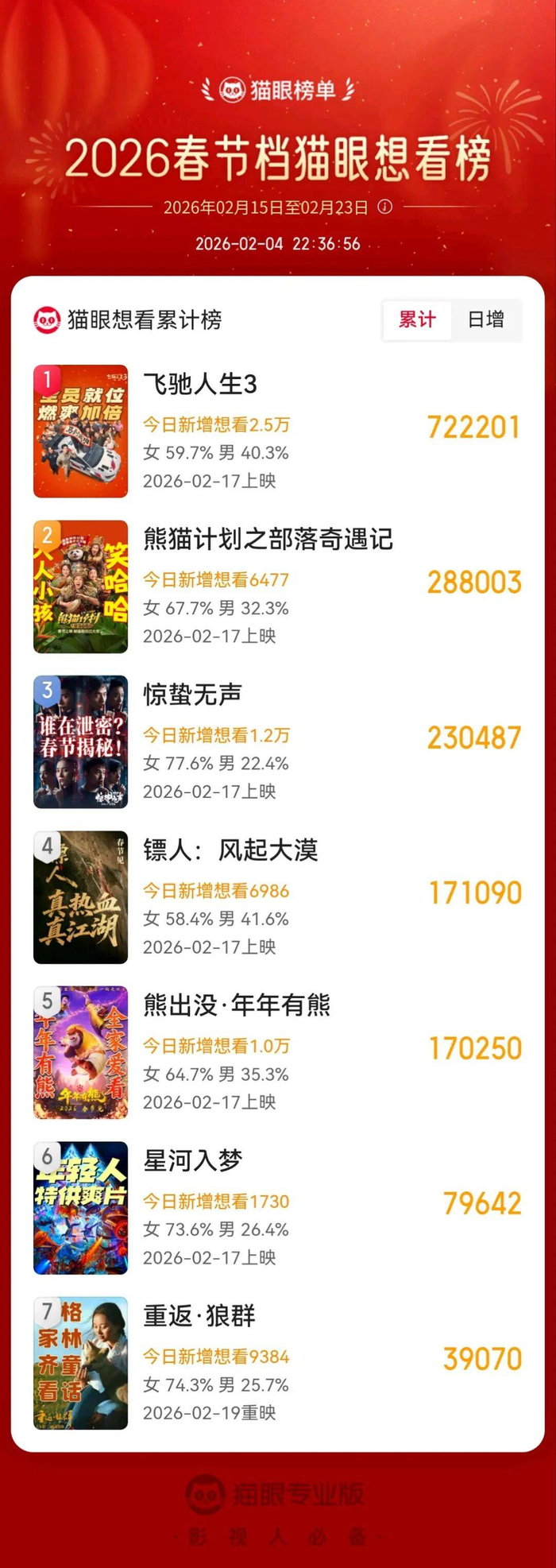 目前在2026春节档猫眼想看榜上《飞驰人生3》《熊猫计划之部落奇遇》《惊蛰无声》位居关注度前三。