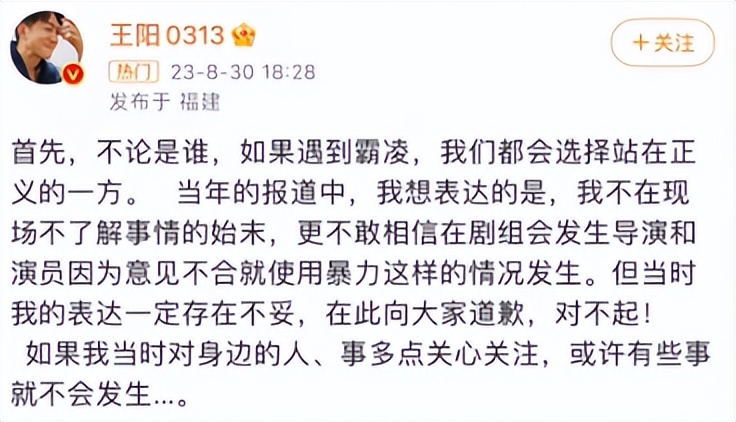 这番平淡回应被部分网友过度解读,觉得他是在变相维护剧组,没有为孙菲菲发声,这件事过去很久后又被重新提起,王阳特意发文道歉,坦言当年自己的表达不够妥当,没能把情况说清楚。