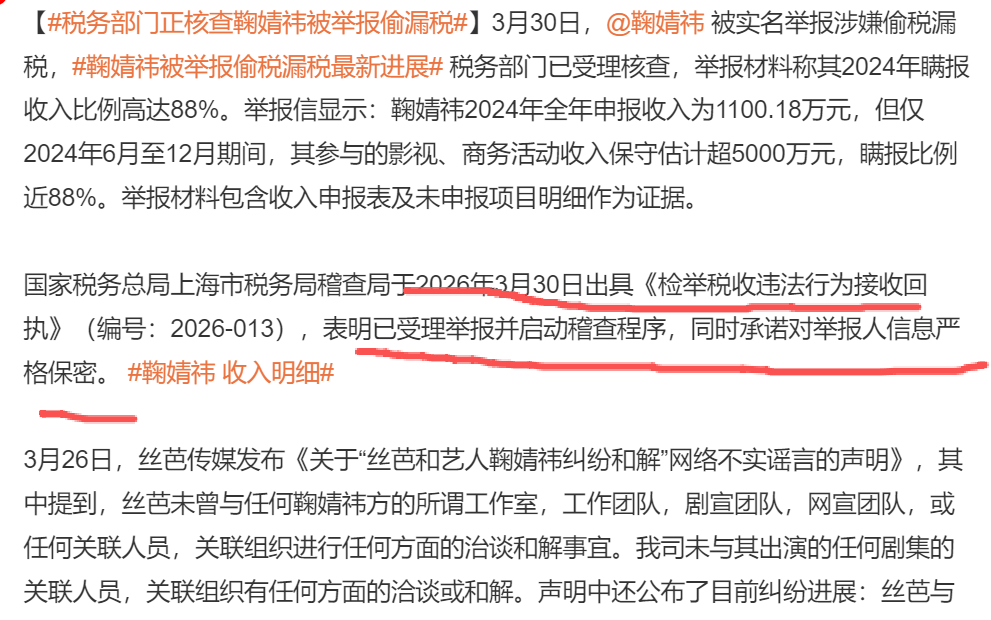 丝芭传媒实名举报鞠婧祎偷税漏税,称其2024年全年申报收入为1100.18万元,但仅2024年6-12月期间,鞠婧祎参与的影视、商务活动收入保守估计超5000万元,瞒报比例近88%。举报材料提交后,有关部门已受理并启动稽查程序。