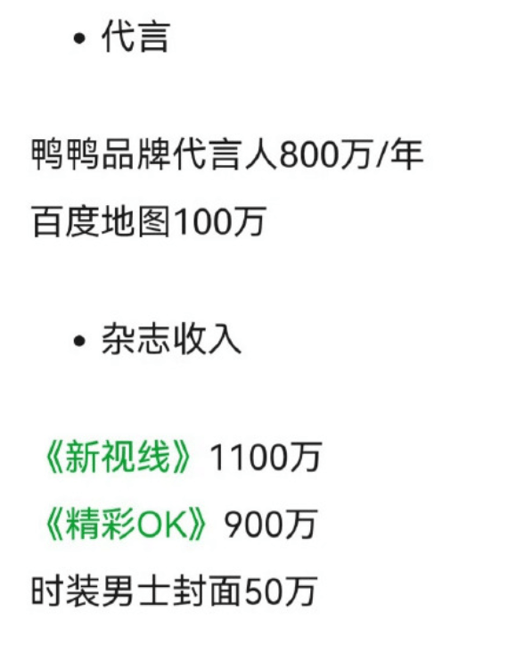 2024年代言了某服装品牌和某地图,两项加起来代言费900万。代言这事儿是挣钱最轻松的,几乎不用干什么,可能配合拍拍照、录录视频就行了,挣的是肖像授权费,和躺着挣钱没区别。