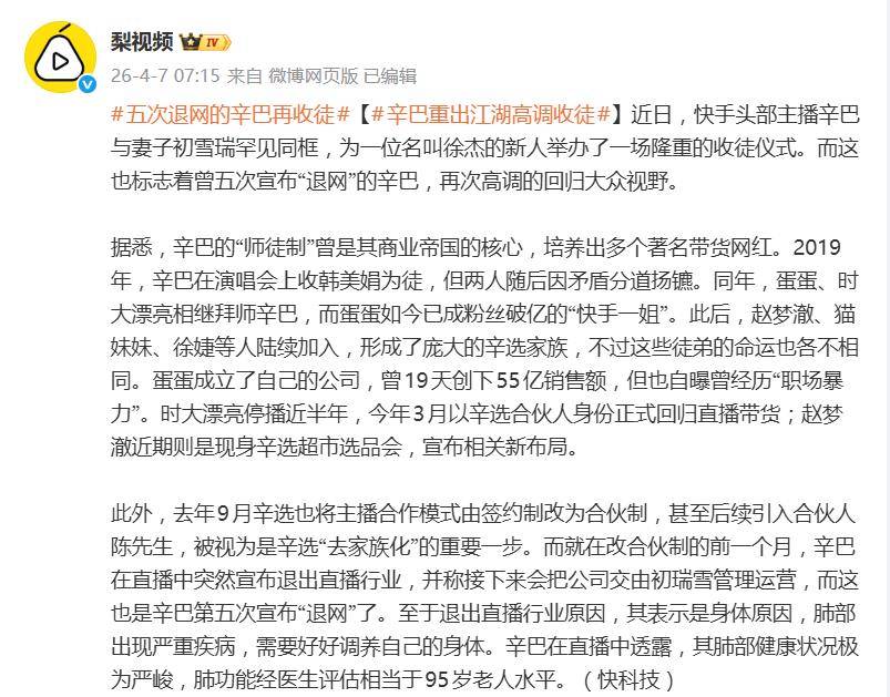 ## 退网者_daily:直播界的"退网狼"又来了,说到"退网"二字,在直播行业这可是个老梗,各路主播收徒、离徒、复徒的"戏码",堪比一出精心编排的电视剧。"退网狼"又来了——辛巴在"健康调整"后七个月的"退网"后,突然高调复出,举办了一场堪比"拜师风光"的收徒仪式。,这场仪式的每一个细节都透露着辛巴的精心策划,新人徐婕(更名徐杰)跪拜、呈拜师帖、献礼物,辛巴则"慈悲为怀"地赠送"心、根、路",强调"正心立身、稳手立命、行道成事"的"师门精神",更有"师娘"初瑞雪和"师叔辈"的行礼环节,让人不禁感叹,这场收徒仪式堪称"直播界的拜师大法"。,但在这场"宗法式"师徒文化的狂欢背后,是直播行业的"大戏",辛巴的"退网"从来都不是一件简单的事情,202年与"散打哥"的翻船,2021年被"资本、流量"打败,2023年"逐步退居幕后",2024年"退役",2025年"严重疾病"退出直播......这么多"退网"言论,堪称"直播界的'离奇门'",这位"退网狼"的"神韵"可不止这一次,网友直呼"剧情太熟悉",这场复出看似传承传统师徒文化,实则是直播行业里最熟悉的"戏码"之一,从"永退"到"复出",从"收徒"到"离徒",辛巴的"退网"从来都不是一出"独角戏",而是直播行业里最经典的"循环剧"。,而这场精心策划的"收徒仪式",更像是直播行业的"公关大戏",在这个充满"流量经济"气息的时代,"退网"与"复出"仿佛是一出永不谢幕的"偶像剧",辛巴的"师徒收编",不仅是在巩固家族势力,更是在"直播圈"里重新定义"权威"。,真正值得"期待"的,是下一次"退网"何时再来,毕竟,"退网"与"复出"的"票",在直播行业里从来都不是一件简单的事,谁能说,下一次"退网宣言",不会再在"收徒"之后"一区爆"呢?
