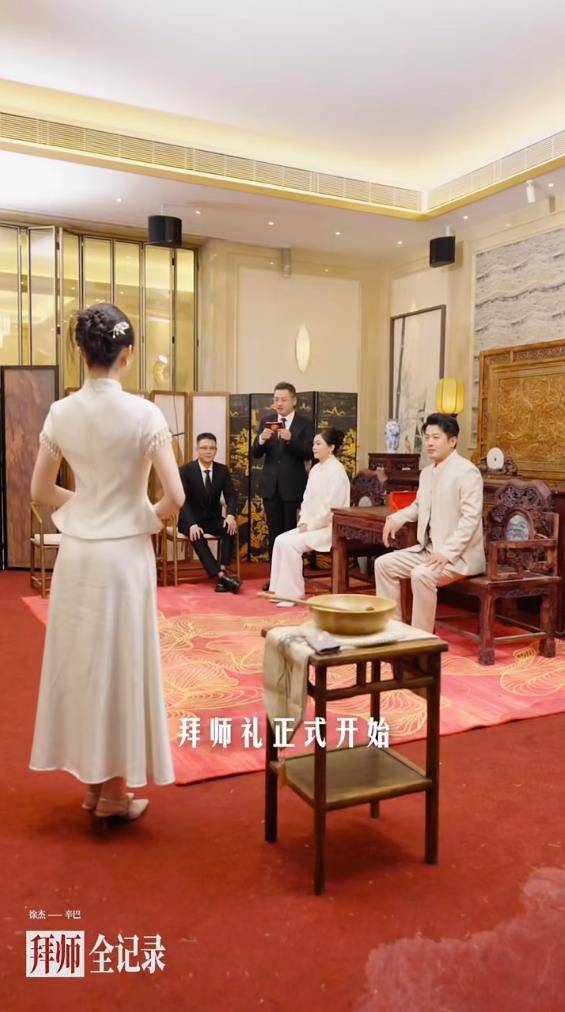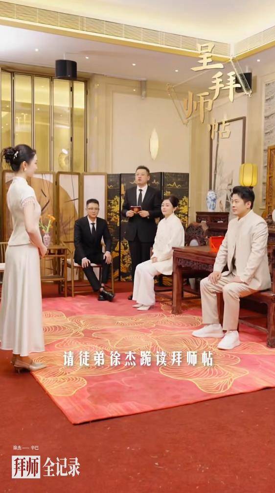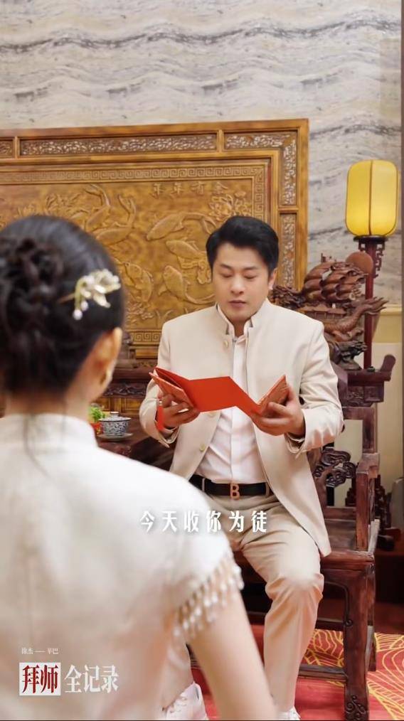 仪式现场,新人徐婕(拜师后更名徐杰)行跪拜大礼、呈拜师帖、并敬献束修六礼,随后向师父辛巴行三拜之礼奉茶,整套流程规矩森严。辛巴则回赠“心、根、路”三物作为训诫,强调“正心立身、稳手立命、行道成事”的师门精神。仪式不仅包含向师娘初瑞雪行礼的环节,还设置了向师叔辈行礼的步骤,全方位强化了辛选家族内部独特的“宗法式”师徒关系与等级秩序。