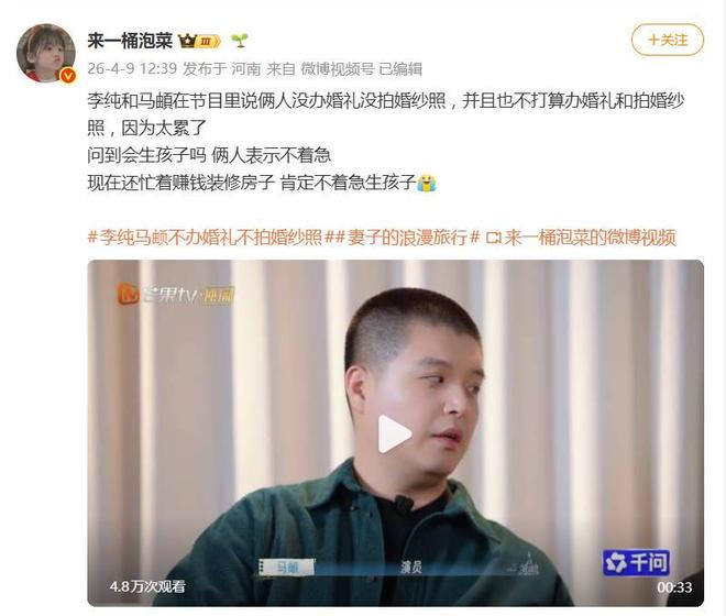 但真正让这个话题“炸锅”的,是这句话与夫妻二人两天前(4月9日)在《妻子的浪漫旅行2026》中的公开表态,形成了堪称“史诗级”的反差。在那档节目里,马頔和妻子李纯才刚明确表示“不着急要孩子”,并强调“我们的人生自己作主”,坦然拒绝外界的催生压力。
