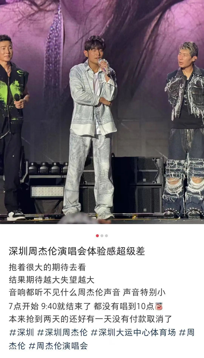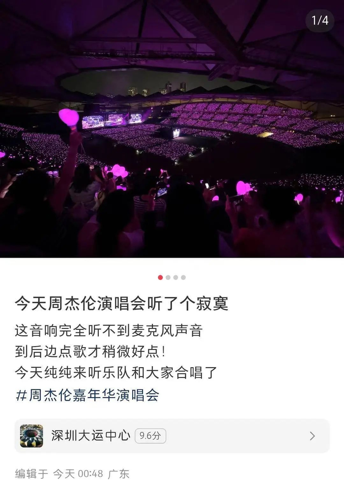 从9月12日起,深圳龙岗大运中心连续四天举办周杰伦深圳场演唱会,在12日演唱会结束后,不少观众在网上发表了自己的观后感,其中相当数量的观众吐槽“听不清”,还有网友开玩笑说“差点就听到周杰伦的歌声了。”