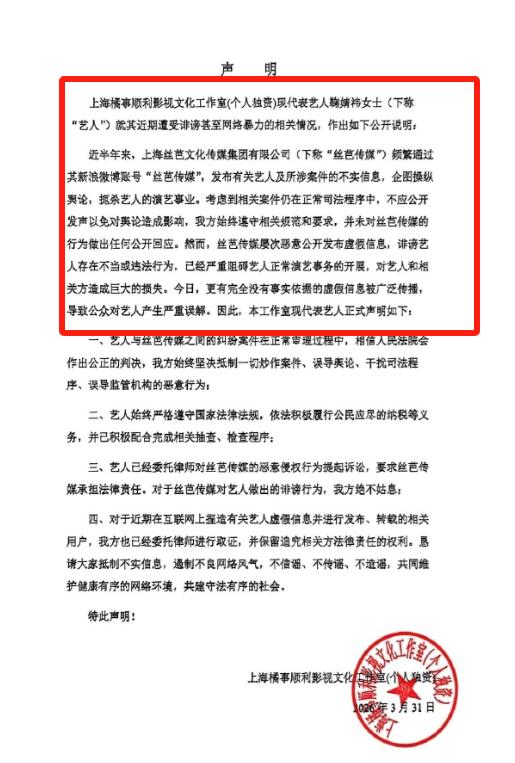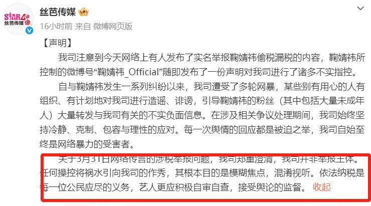 “丝芭传媒近半年来,频繁通过官方账号发布有关鞠婧祎的不实信息,企图操控舆论,扼杀艺人的演艺事业!”