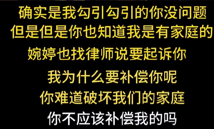 不仅如此在相关对话中,他不仅承认是自己勾引在先,但转头就让对方赔偿自己。
