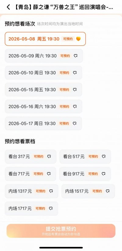 **2026青岛薛之谦演唱会门票价格及相关信息简评**,关于2026年青岛薛之谦“万兽之王”巡回演唱会的消息正在热度渐起,粉丝们纷纷表示不容错过,作为一场备受期待的演唱会,这场巡回演唱会在青岛站的门票信息已经曝光,以下是对本次演唱会门票价格及购票信息的详细解读。,**1. 门票价格**,本次演唱会在青岛的票价涵盖了不同的看台和场次,价格区间从317元到1717元不等,门票种类包括看台和内场,具体价格如下:,- **看台票**:317元、517元、717元、917元,- **内场票**:1317元、1517元、1717元,从价格来看,内场票价格较高,内场1317元起步,最高售价1717元,而看台票则从317元开始,最高售价917元,价格区间较为合理,覆盖了不同消费层次的观众需求。,**2. 购票时间**,购票时间分为预售和第二次销售两个阶段,具体时间如下:,- **预售时间**:, - 5月8日、5月9日、5月10日场次:2026年4月9日17:17分开始预售, - 5月15日、5月16日、5月17日场次:2026年4月13日(周一)17:17分开始预售,- **第二次销售时间**:, - 5月8日-5月10日场次:4月27日17:17分, - 5月15日-5月17日场次:4月28日17:17分,预售和第二次销售时间相差较大,预售时间较早,第二次销售时间稍后,购票者可以根据自身购票习惯选择合适的购票时间,避免错过所需门票。,**3. 购票平台**,本次演唱会的购票平台为大麦网,作为国内知名的购票平台,大麦网具有较高的购票信任度,购票者可以通过大麦网官方网站或APP进行购票抢票。,**4. 温馨提示**,为方便购票者查询最新购票信息,官方还提供了多种途径:,- **关注公众号**:微信搜索公众号【青岛本地宝】,关注后在对话框回复【薛之谦】即可获取最新消息。,- **持续更新**:购票平台、演出时间、地点、须知等信息将持续更新,购票者需保持关注。,**5. 观众期待**,作为“万兽之王”巡回演唱会的一部分,薛之谦的演唱会以其震撼的舞台效果、动人的演唱和深情的歌词著称,本次青岛站的演唱会备受期待,门票价格的合理设计也为更多粉丝创造了参与的机会。,**6. *,总体来看,本次青岛薛之谦演唱会的门票价格透明合理,购票时间分阶段,购票平台稳定,信息查询便捷,无论是预售还是第二次销售,购票者都可以根据自身情况选择合适的购票策略,作为一场备受期待的演唱会,本次巡回演唱会无疑将为青岛的音乐爱好者带来一场难忘的音乐盛宴,期待看到更多粉丝的热情参与和支持!## 青岛薛之谦巡回演唱会:音乐之声,心灵之旅, , 在音乐的海洋中,青岛的这片土地上,一场盛大的音乐盛宴即将到来,薛之谦的"万兽之王"巡回演唱会将在青岛国家大剧院登场,汇聚了无数音乐爱好者和文化追求者,共同感受这场震撼人心的音乐盛宴。, , 这场演唱会不仅仅是一个音乐表演,更是一场文化盛宴,薛之谦的音乐作品始终以深刻的社会关怀和独特的艺术视角著称,他的歌词常常探讨现代都市人的困境与救赎,传递着积极向上的生活态度,在青岛的这场演唱会上,观众将有机会亲身体验薛之谦音乐世界的魅力。, , 门票价格分为看台和内场两种座位区,内场提供了更近距离的观演体验,价格分别为1317元、1517元和1717元;看台票价为317元、517元、717元和917元,购票时间分为预售和第二次销售,预售时间分别为2026年4月9日和4月13日,第二次销售时间分别为4月27日和4月28日,购票平台为大麦网,方便快捷。, , 青岛国家大剧院作为演唱会的举办地,配备先进的音响设备和完善的场馆设施,为观众带来无与伦比的观演体验,场馆内的观众座位布局合理,内场座位更为有限,适合追求最佳观演体验的观众。, , 这场演唱会不仅是对音乐的享受,更是一次文化交流的盛宴,通过音乐,薛之谦传递着积极向上的生活态度,激励着每一个人在生活中坚持自我、追求梦想,青岛作为文化名城之一,这次演唱会也将成为推动当地文化事业发展的重要契机。, , 作为音乐爱好者和文化追求者,我们不仅期待这场演唱会带来美妙的音乐体验,更期待它能为青岛乃至全国的文化发展注入新的活力,让我们一同走进这场音乐盛宴,感受薛之谦音乐世界的魅力,开启心灵之旅!