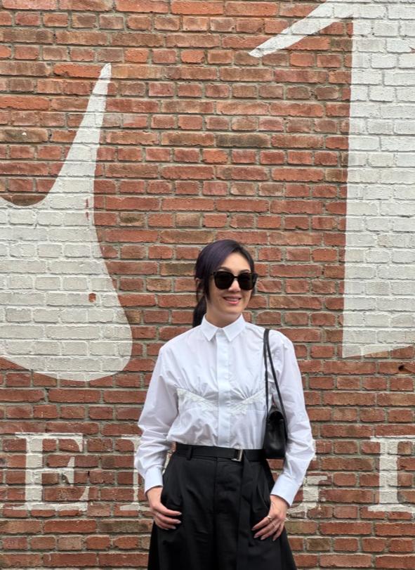 她上身是基础款白衬衫,干净简约,下身搭配灰色阔腿裤,面料柔软宽松,头发扎成低马尾,留着轻柔斜刘海,造型毫无修饰感。