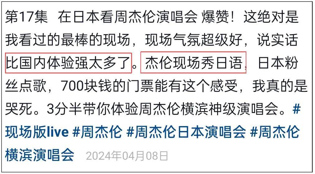 对比中日两地粉丝的演唱会反馈,能明显看到周杰伦对日本演唱会更上心,粉丝们也直言比国内体验感强太多,称周杰伦不仅现场秀日语。还能唱高音。