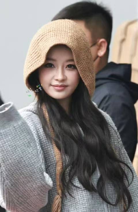 孙怡戴针织帽,穿灰衣甜笑温柔。