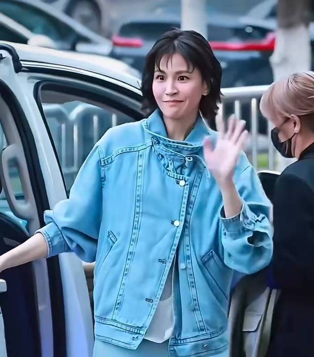 温峥嵘穿米白风衣,挥手甜笑温婉大气。