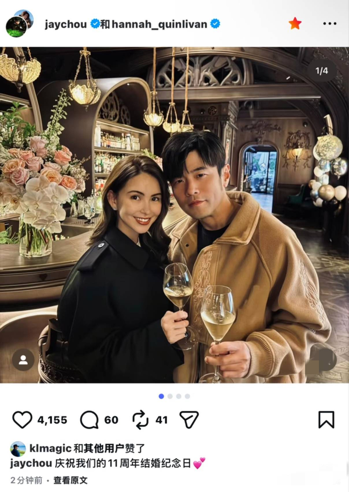 在一家别致的餐厅里,周杰伦和昆凌举杯庆祝,两人依偎在一起,周杰伦穿着一件卡其色的外套,脸微微偏向昆凌那边,昆凌则穿着黑色的大衣,笑容灿烂如阳光,仿佛时光在这一刻静止。这种幸福感流露得如此自然,谁都能感受到他们眼中闪烁的爱意。