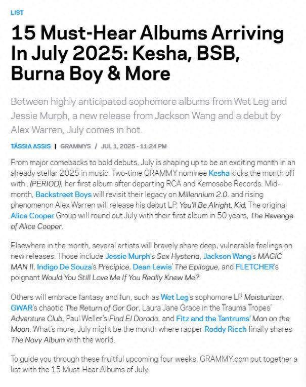 近日,格莱美官网发布“2025年7月即将到来的15张必听专辑”,其中提到了王嘉尔 的《Magic Man2》!