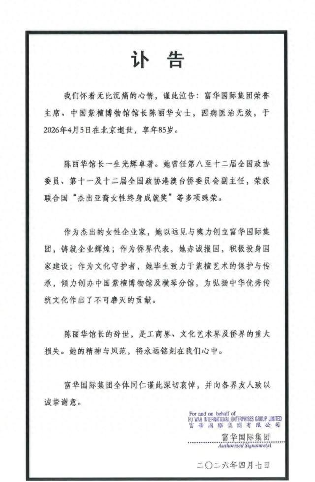**陈丽华:从“唐僧妻”到“紫檀女王”,一生填满了传奇与坚持** ,4月7号,媒体传出消息,知名女富豪陈丽华不幸因病去世,享年85岁,这个消息让网友们热议不已,不仅是对一位商界巨人的离别,更是对一个跨越36年的爱情故事的终结,陈丽华的去世引发了诸多话题,尤其是她与“唐僧”迟重瑞的感情经历,堪称现代都市爱情的经典题材。 ,陈丽华的名字,很多人是通过“唐僧”迟重瑞认识的,两人相识于一场京剧活动,陈丽华比迟重瑞大11岁,199年结婚时,外界一片唱衰,各种负面标签如“傍大款”“老牛吃嫩草”“各取所需”接连出炉,但在这36年的日子里,陈丽华和迟重瑞从未在言语和行动上开过玩笑,他们婚后互称“董事长”和“迟先生”,说话用“您”,这种称呼的严肃感令人印象深刻。 ,陈丽华还定下三条规矩——不生孩子、不插话、睡觉不许四仰八叉,外界解读为“卑微”“压抑”“软饭难吃”,但迟重瑞在综艺里回应过:“我感觉就是能够相互理解,她能够理解我,我能够理解她,俩人在一起就很幸福。”这句话道出了他们36年感情的真谛:真爱不以物质为前提,而是以相互理解和默契为基础。 ,陈丽华的成就同样令人瞩目,她出身贫寒,高中辍学,从缝纫工做起,后来到香港炒房发家,回国后拿下长安街地块,建成长安俱乐部,又操盘改造金宝街,这条全长730米、西起王府井、东到东二环的街道,在陈丽华手里从危旧平房变成了北京最贵的高端商业地标,她一路攀升,2016年以505亿元成为中国女首富,2026年胡润全球富豪榜上以470亿元位列第656位。 ,除了商业成就,陈丽华还用行动回馈社会,她在1999年斥资2亿元创办中国紫檀博物馆,这是国内首家“国”字头的民营博物馆,填补了国内空白,陈丽华曾说:“把紫檀留给后人,比留钱更有意义。”这句话道出了她一生追求的价值观:财富可以变来变去,但文化和传承才是真正重要的。 ,陈丽华的最后一幕却让人心酸,据传她生前已立遗嘱,四个子女各得100亿,剩余约180亿归迟重瑞所有,迟重瑞曾公开拒绝过这份遗产安排,但陈丽华坚持,这种坚持不仅是对迟重瑞的宠爱,更是对自己一生选择的坚守。 ,陈丽华的最后一次公开露面在今年2月,一身红衣在紫檀馆录制宣传视频,镜头里的她看起来笑容满面,但细看之下,脸色苍白,状态并不自然,不到两个月后,她便与世长辞。 ,一代女首富,从贫寒辍学到坐拥京城半条街,从缝纫工到女首富,从被群嘲的“唐僧妻”到让所有人闭嘴的“紫檀女王”,她用85年活出了几辈子的厚度。 ,而那个演了唐僧的男人,在戏外用36年证明了一件事:真正取到真经的人,从来不靠念经,靠的是用一生去守护一个人的选择。 ,时间不会说谎,它会给出所有答案。 ,陈丽华女士,一路走好。 ,(完)