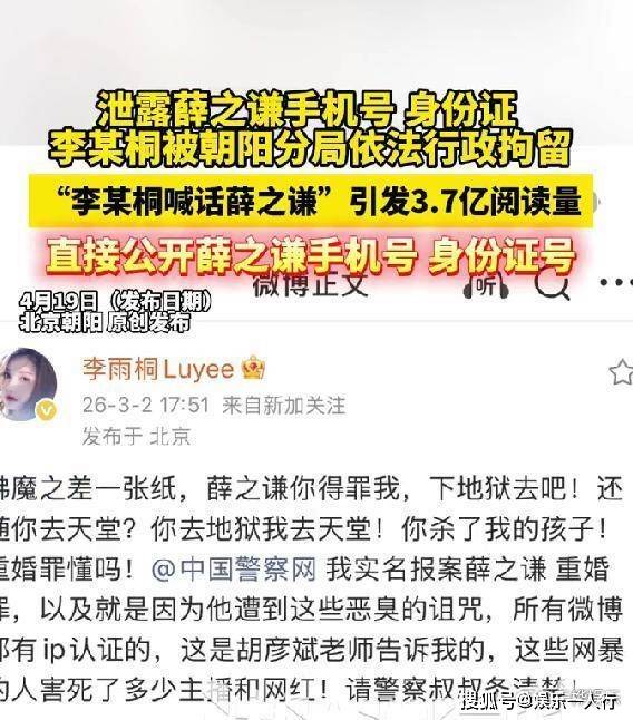 2026年4月19日下午,北京广播电视台《法治进行时》栏目曝出消息。李雨桐因泄露薛之谦手机号和身份证号,被北京朝阳警方依法行政拘留十日。拘留日期从2026年4月10日开始,到4月20日结束。