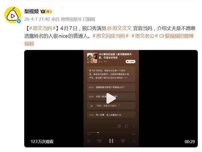 思文在个人微博上晒出了儿子的背影照,文字里流露出满满的温情:给大家正式介绍下:我儿子,多多。欢迎来到这个世界,希望他健康平顺,喜忧自安。消息一出,瞬间引起网友们的关注和热烈讨论。随后,她在自己的播客节目中,进一步分享了更多细节,并确认丈夫是一位圈外人士,身份选择低调保密。