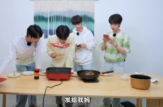 《福气TV》贺峻霖和丁程鑫做的鱼很成功,两人立马拍照给妈妈看,还要给爸爸炫耀一番。贺峻霖小而精致的五官,妈妈的功劳不小,曾有假瓜称“女孩机场靠在贺峻霖肩膀说话”,其实是妈妈和贺峻霖凑在一起看手机。