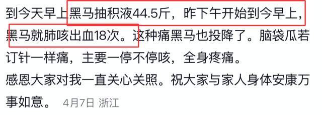翻看其最后一条动态不难发现细节,她在7号的时候曾透露肺部咳出血高达18次,那种彻骨的痛让其无法忍受,所以说,这样的离开对于她来说,算得上一种解脱,当然,也包括她的个人感情。