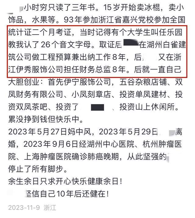 据了解,钱水凤是湖州的一位成功女士,名下有11家财务分公司,另外还有建材、农庄、农产品、茶吧等项目,可以说,她的人生达到了完美,但婚姻生活并不是很幸福,这也是为什么开头有那番感慨的原因。