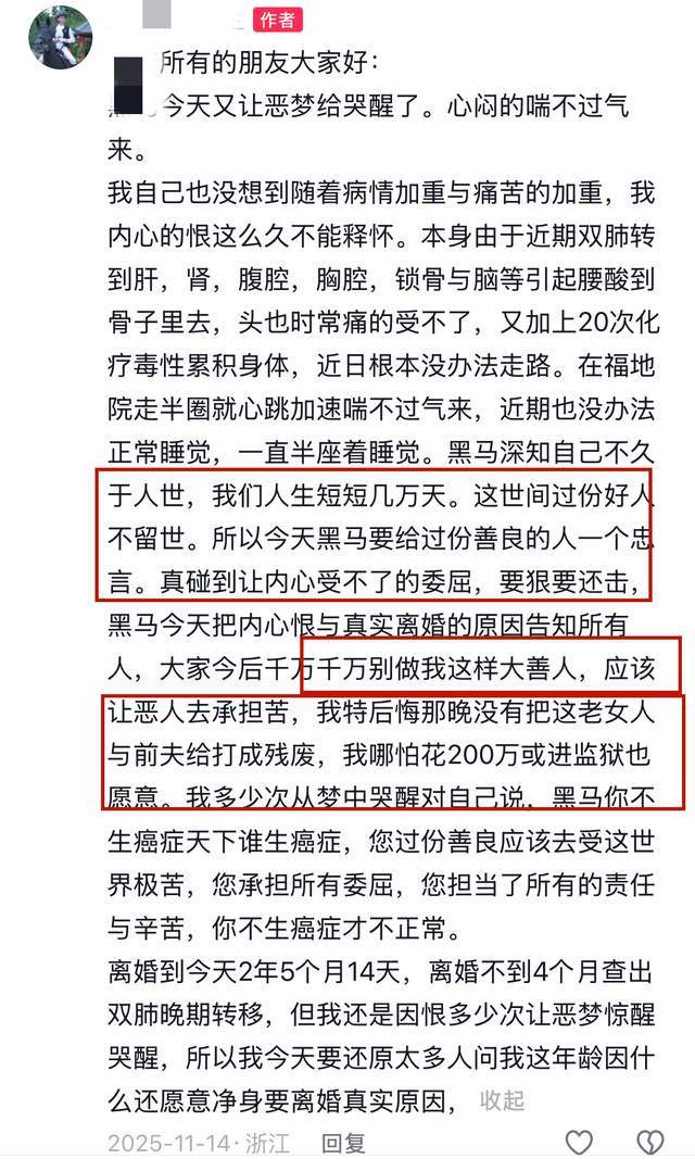 **湖州“隐忍30年”富婆钱水凤:我不善良,你能怎么样?**,在这个充满戏剧性的人生大戏中,湖州55岁的“隐忍女强人”钱水凤的故事,堪称一部现代社会女性励志传记,从底层小商贩到跨足多个行业的成功女士,再到隐忍三十年的婚姻背叛,她的一生充满了起起落落,最终以“完美分手”和“完美离世”画上了句号。,### **从底层到成功:一场艰难的蜕变**,钱水凤的故事始于贫穷和挣扎,她曾在十五岁那年开始卖冰棍、饰品和水果,靠着双手换来温饱,后来,她通过参加统计证考试,在惠州白雀建筑公司做工程预算兼出纳,长达八年,后来,在浙江伊秀服饰公司担任财务总监,积累了丰富的经验。,1993年,她开始人生的转折点——创业,通过一系列精准的投资和业务拓展,她的财力逐渐壮大,最终创建了名下11家财务分公司、建材店、农庄、茶吧等多个项目,可以说,她的人生达到了“完美”的状态。,这份成功并未带来幸福的婚姻,她和丈夫的感情从一开始的甜蜜逐渐转变为冷漠,最终因出轨和染病而破裂,面对婚姻的背叛,钱水凤选择了隐忍三十年,选择了“好女不嫁二夫”的传统观念,尽管如此,她依然为儿子留下了“净身出户”的遗产。,### **隐忍三十年:一场无声的煎熬**,钱水凤的隐忍生活,就像一场无声的煎熬,她在小镇上默默无闻,经营自己的业务,却在内心承受着巨大的委屈,这种隐忍不仅是对家庭的无奈,更是对传统观念的妥协,她曾在评论区写道:“真碰到让内心受不了的委屈,要狠要还击,大家以后千万千万别做我这样的大善人,应该让恶人去承担苦……”这句话道出了她的心声,也揭示了她内心的挣扎。,这种隐忍并未带来内心的平静,反而成为了她健康的隐患,长期的压抑和心理负担,最终导致她患上严重的肺癌。,### **“完美分手”:一场戏剧性的终章**,2023年4月,钱水凤看到了丈夫再次出轨的证据,终于下定决心离婚,她不仅选择了“净身出户”,还将所有资产留给了儿子,这个“完美分手”看似潇洒,实则是一场深刻的心理释放。,正如历史总是充满讽刺,这场宣泄带来的并非真正的解脱,四个月后,她确诊肺癌,开始了无休止的化疗,她选择在自己建造的小院中独自面对死亡,完成了“完美离世”。,### **一个关于善良与隐忍的启示**,钱水凤的一生,充满了对传统观念的反思,她从一个善良的底层小商贩,到一个隐忍三十年的“隐忍女强人”,再到最后的“完美分手”和“完美离世”,她的经历不仅仅是一个个情节的堆砌,更是一部关于现代女性生存与选择的深刻著作。,她的故事告诉我们,人生不是一场选择题,而是一场无声的考验,在面对家庭、事业、命运的各种挑战时,我们需要学会如何在善良与坚韧之间找到平衡,钱水凤的经历,也提醒我们:不善良或许才是更好的选择。,这或许就是命运的公平与不公平的真谛——它总是公公平平地给予我们生活的重量,而我们要学会如何在命运的重担下,找到属于自己的出口。在这个充满戏剧性的时代,湖州的“富婆钱水凤”故事无疑成为了一段令人捧腹又唏嘘的“吃瓜”材料,这个曾经风风火火的女强人,在事业有成、家庭破碎、离婚后确诊癌症,最终走到生命尽头的过程中,堪称一部现代女性悲剧剧本。,说到钱水凤这个名字,很多人会联想到“成功女士”的标签,作为湖州一位传奇女性,她的人生轨迹堪比一部上世纪八十年代的励志片,从小卖冰棍、小饰品,到后来的统计证考试、财务总监,再到创办11家财务分公司、建材、农庄、茶吧等事业,她的生活仿佛被一部“成功之光”镀上了一层光晕,这种光鲜背后,却隐藏着一段看似“完美”的家庭生活。,钱水凤的婚姻生活并非一帆风顺,她的前夫不仅有出轨,还染上了不明的“病”,在社会舆论的熏陶下,一个有能力、有财富的女性,为何还要忍受这样的婚姻?那些熟悉她的故事的人说,她最初选择了隐忍,这不仅是因为“好女不嫁二夫”的传统观念,更因为她当时觉得自己太过善良,无法对丈夫下狠手。,命运的齿轮最终还是转了弯,2023年,她被同小区的好友无意中提到前夫再次出轨,经过一番周密的策划,她终于拿到了足够的证据,选择了离婚,20天后,她做出了一个让人唏嘘的决定——净身出户,资产全部留给儿子,这一选择看似潇洒,实则暗藏着无尽的悲剧。,没想到,4个月后,她的身体就被诊断为肺癌,这场疾病如同一把无情的刀,将她推入了苦不堪言的化疗生活,面对命运的打击,她选择了搬进自己建的“福地小院”,日复一日地修身养性,但最终,这些努力还是没能抵挡住病魔的侵蚀。,钱水凤的故事引发了不少人对“善良”与“人生”的思考,她的遗言中那句“做人不能太善良”仿佛在对所有读者发出一记耳光:在这个充满阴谋与算计的世界,你要善良,终将被踩到地狱,她的经历告诉我们,所谓的“福禄双全”或许不过是天公的谎言,而人生最真实的写照,往往是一场残酷的现实之戏。,这位曾经的“成功女士”最终走完了自己的舞台,而她的故事,依然让人捧腹又唏嘘,既是对“善良”与“人性”的讽刺,也是对“命运”的无奈宣泄,在这个充满不确定的世界里,或许我们都该学学她,那种对生活的无奈与反抗,或许正是我们最真实的写照。