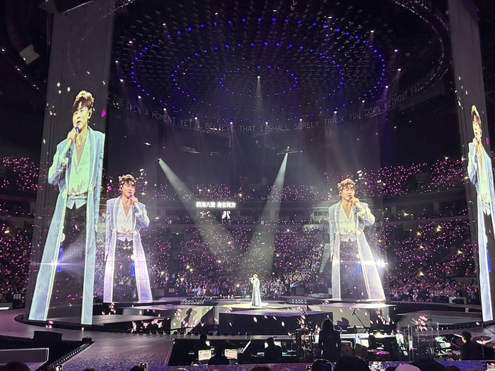 演唱会以一首《勿忘心安》激情开场,瞬间引爆全场大合唱。本次演唱会舞台融合银河星盘、山水意象,科幻感与东方美学交织,尽显“九天星梦”的浪漫。有意思的是,舞台设计中还巧妙融入了四川人熟悉的麻将、龙门阵等元素。