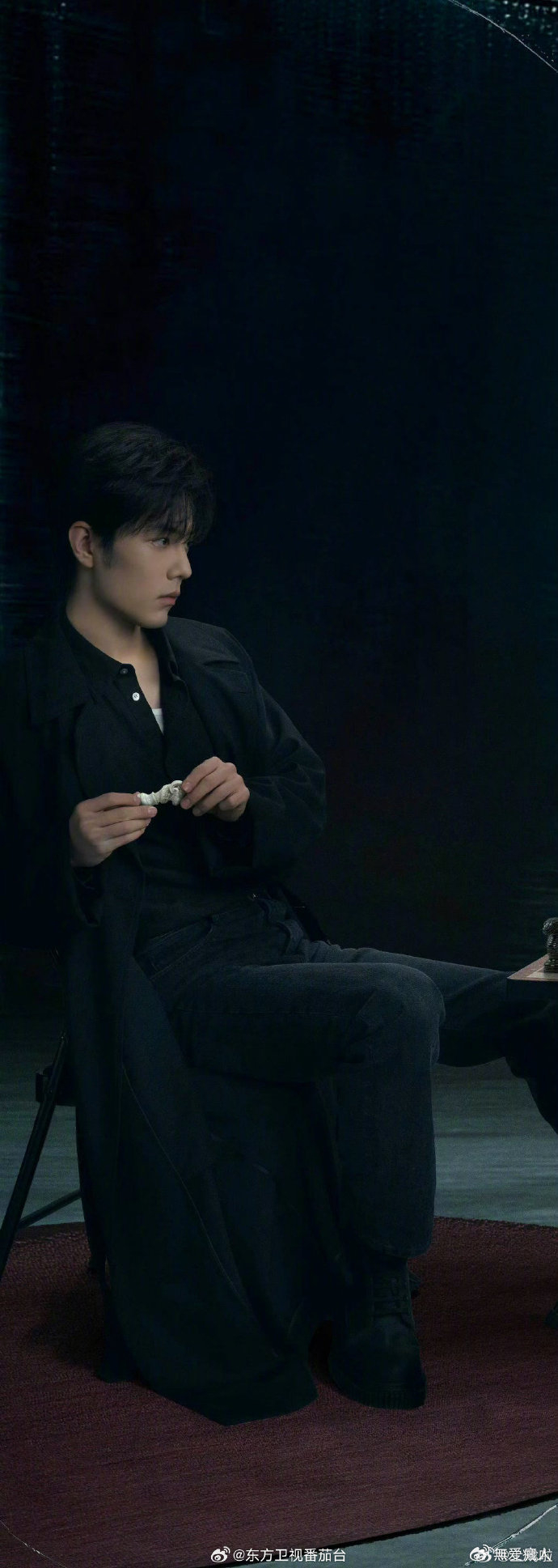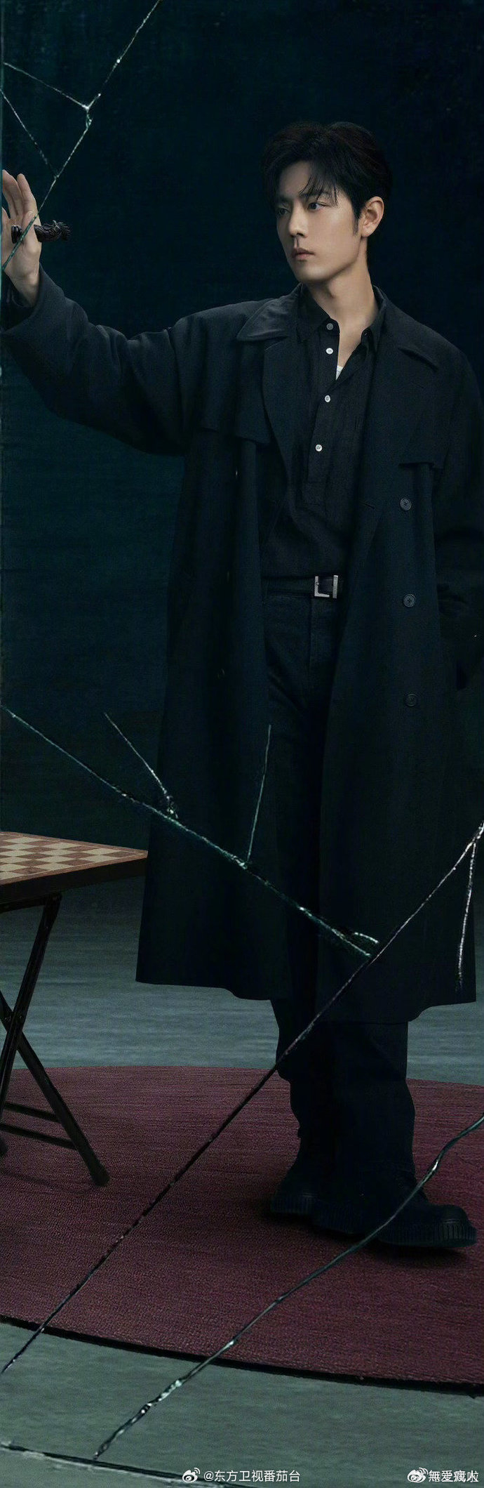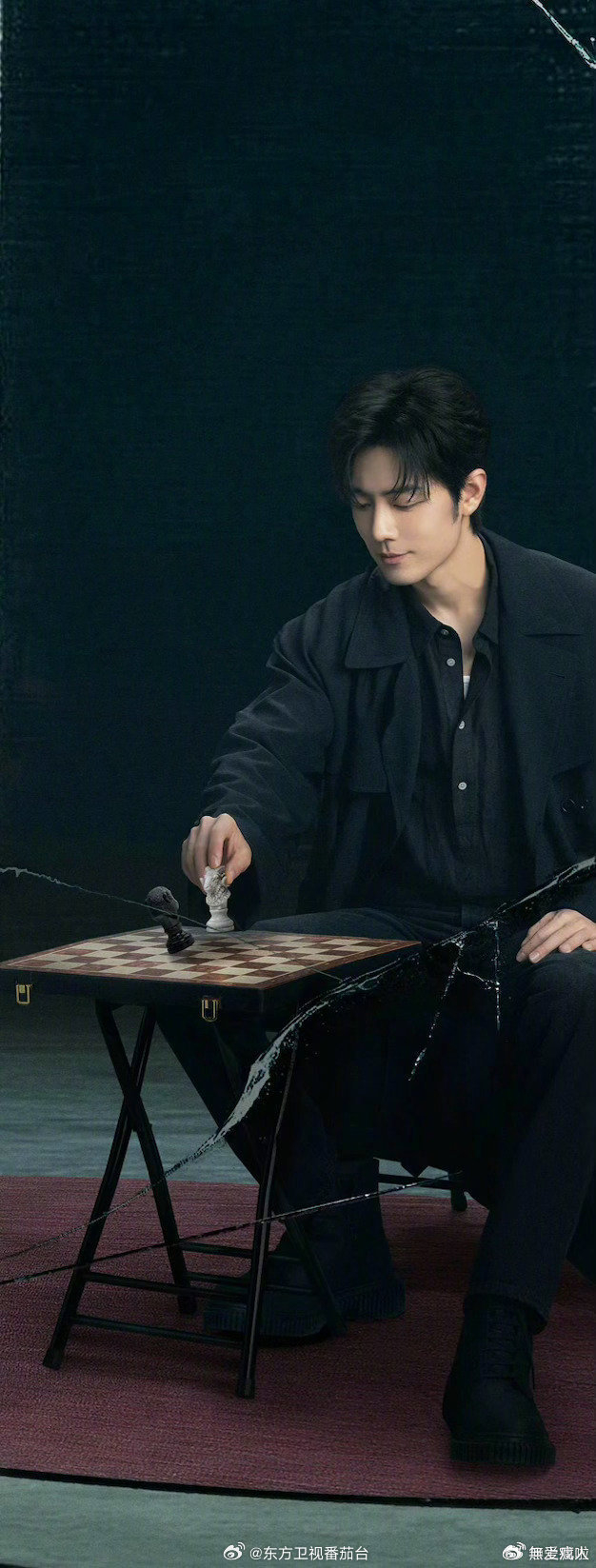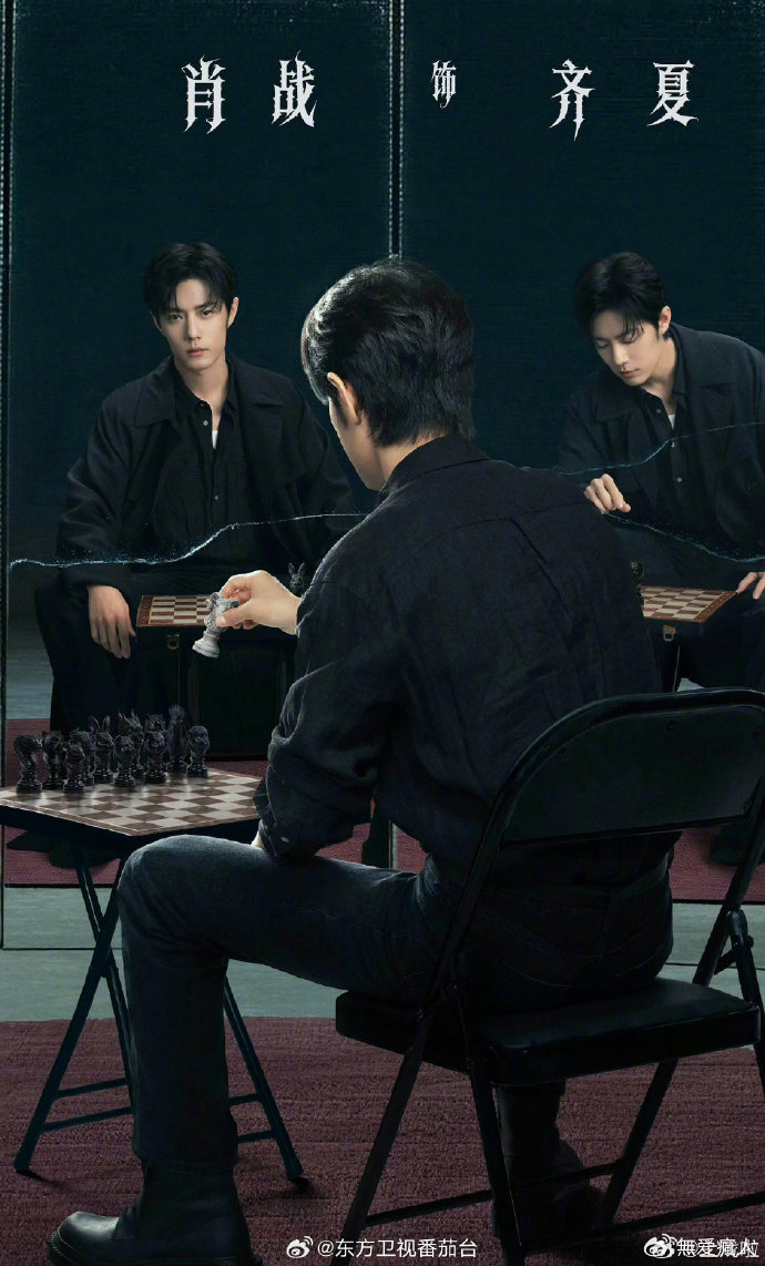 肖战身着黑色系服装,端坐在棋盘前,背影挺拔而孤寂。他手持棋子,似在思索着一场关乎命运的博弈。镜子中的两个“齐夏”,一个目光冷峻直视前方,一个低头凝视棋局,仿佛在与自己对弈,又像是在探寻内心深处的秘密。破碎的镜面裂纹,为整个画面增添了几分破碎感与神秘感,让人不禁好奇齐夏这个角色背后隐藏着怎样的故事。