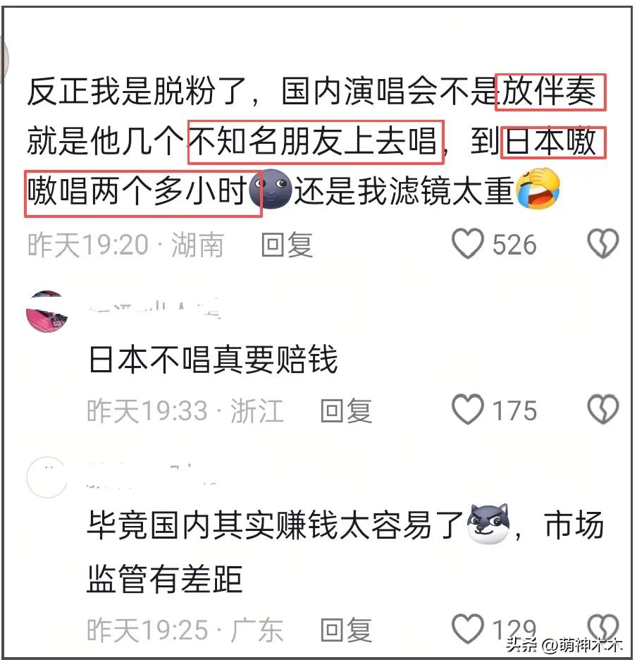 在大量吐槽声中,有粉丝还称周杰伦国内国外两副面孔,在国内不是放伴奏带就是请朋友凑演唱时间,而到了日本则情绪高昂演唱两个多小时,态度完全不一样。当然,有网友指出区别来自两地的监管力度不一样,若在日本不唱满会罚款。
