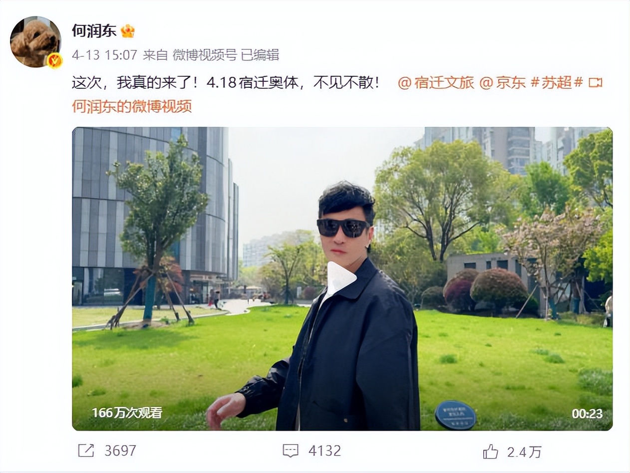 4月13日下午,演员何润东发视频宣布,接受江苏宿迁的邀约,将于4月18日,以项羽扮演者的身份来到项羽故里宿迁,助阵苏超。