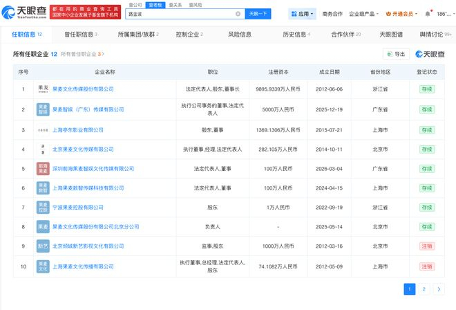 此外,赵子琪丈夫路金波名下关联10余家企业,其中8家企业处于存续状态,包括果麦文化传媒股份有限公司、果麦智娱传媒有限公司等,路金波在上述企业担任法定代表人、董事长等职务。