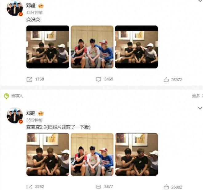 6月30日,邓超发文晒与鹿晗陈赫合照,并配文:“变没变?”