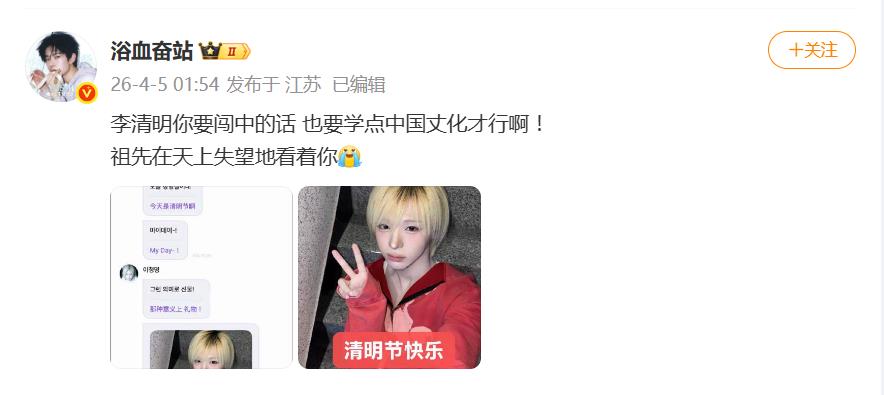 韩国艺人李清明在2026年清明节(4月5日)的一则社交动态,在网络溅起了不小的水花。他将这个中国传统祭祖节日直接称为“my day”(我的节日),并祝大家“清明节快乐”,此举迅速引发了网友的广泛争议和讨论。