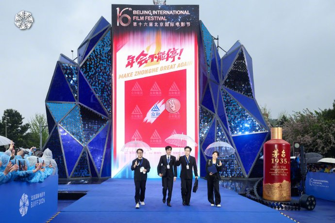 2026年4月16日,北京国际电影节开幕式红毯迎来一抹独特的“职场风景”——电影《年会不能停2!》剧组以创意十足的“打工人”造型登场,导演董润年、制片人应萝佳携领衔主演张若昀、白客亮相,用公文包、工牌和诙谐互动精准呼应影片内核,瞬间点燃全网话题焦点。
