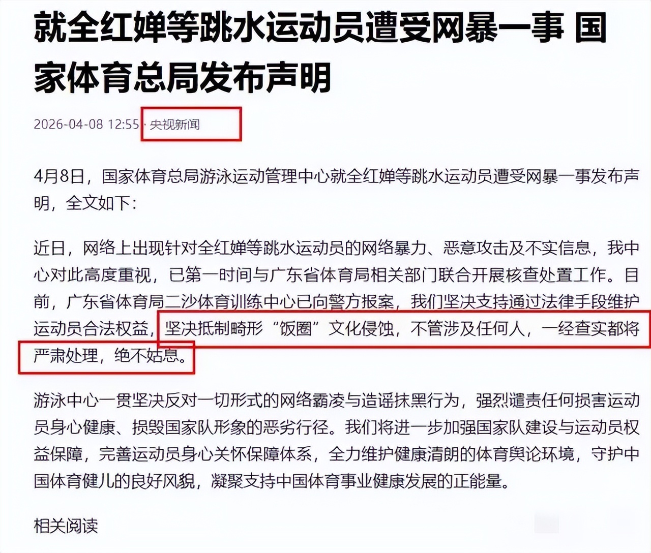 这一次,官方没有像以往那样。4月8日,全红婵所在的广东省二沙体育训练中心发布了一则声明,措辞相当严厉:已经向公安机关报案,将通过法律途径坚决追究网暴者责任。
