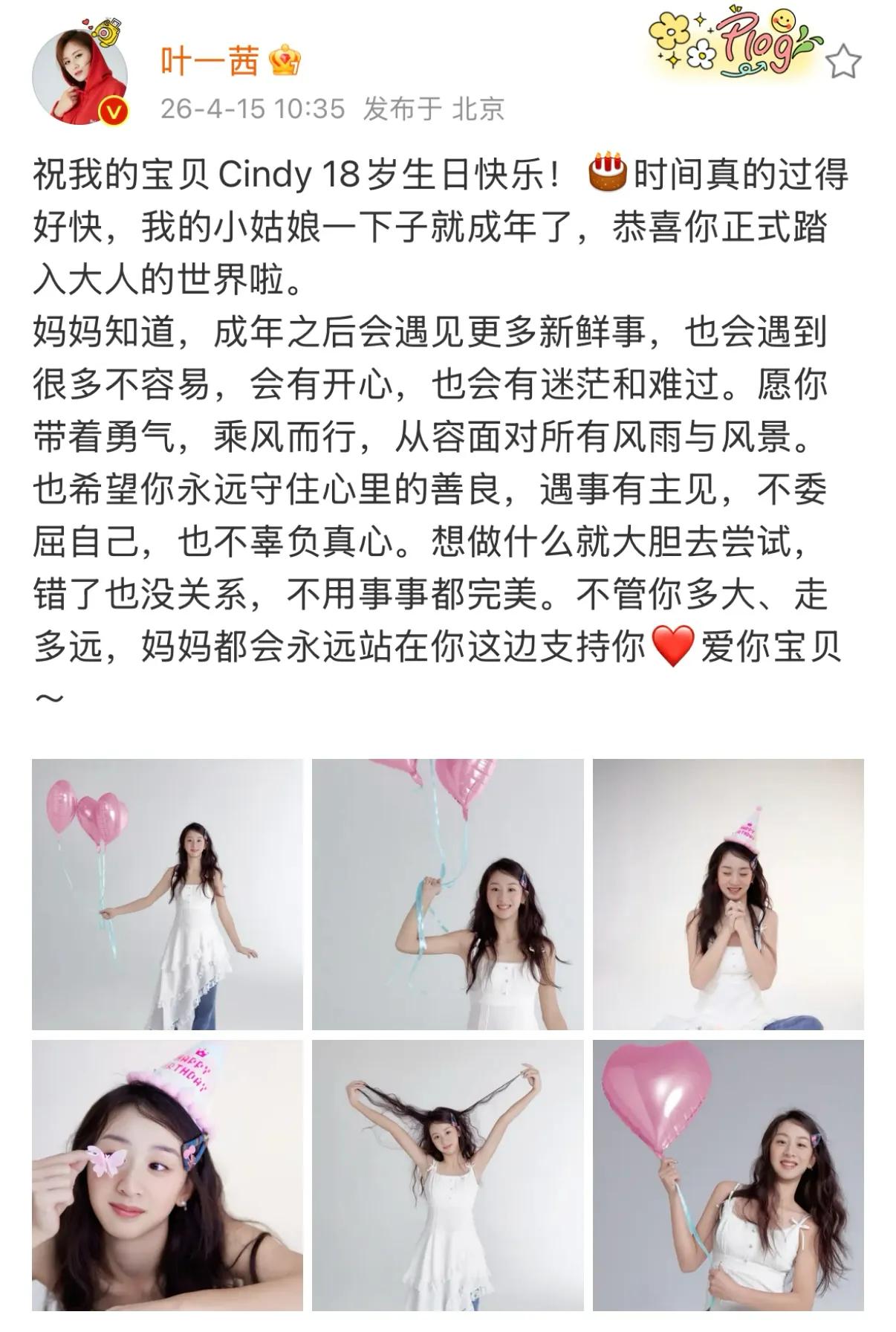 4月15日,田亮叶一茜在社交平台发文为女儿森蝶庆祝18岁生日,并晒出森蝶的最新写真。