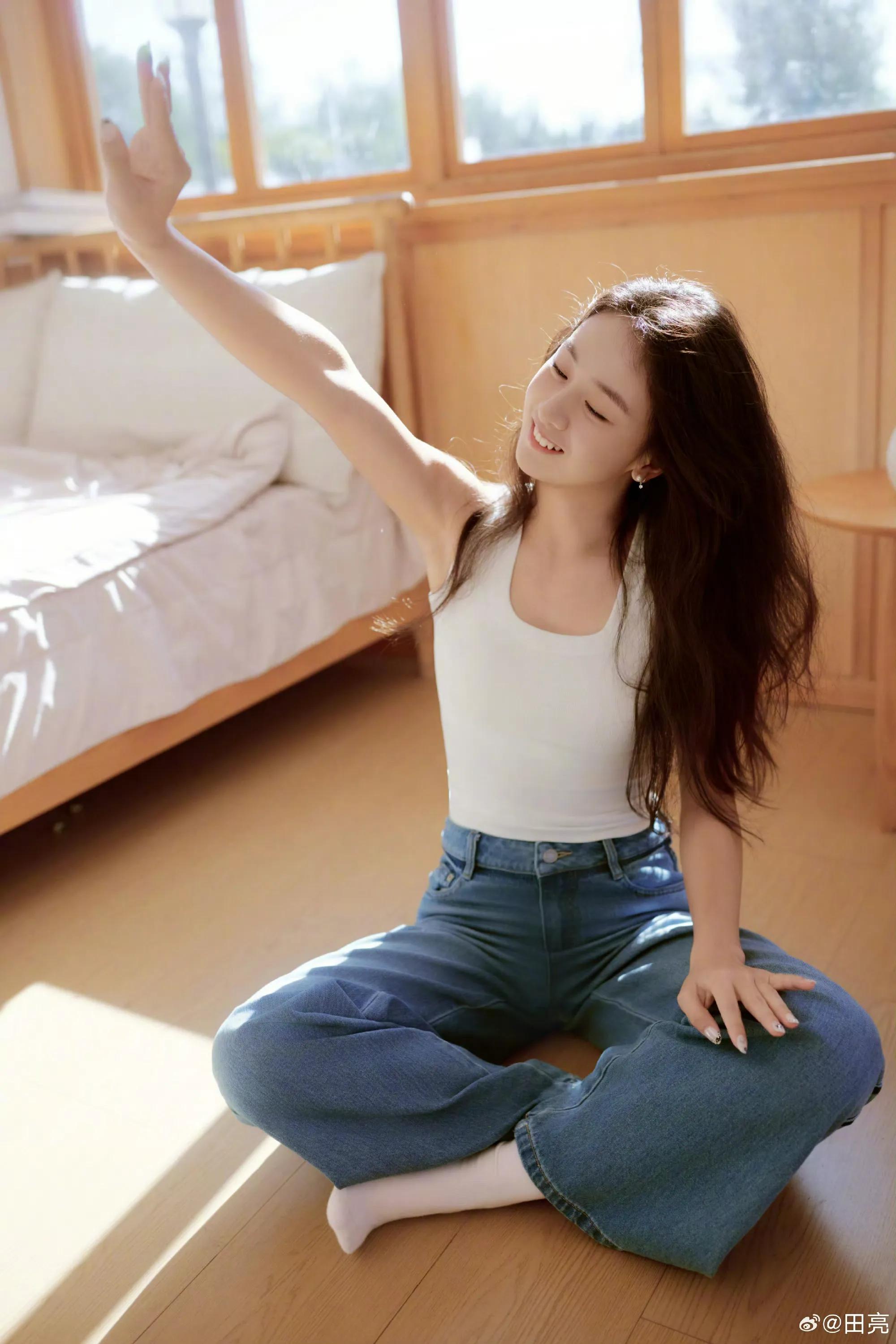 田亮晒出的一组写真中,森蝶披着一头长卷发,身穿白色背心搭配牛仔裤,打扮清爽自然,尽显青春活力。她坐在卧室地板,面带灿烂笑容,看起来好漂亮,元气少女感十足。