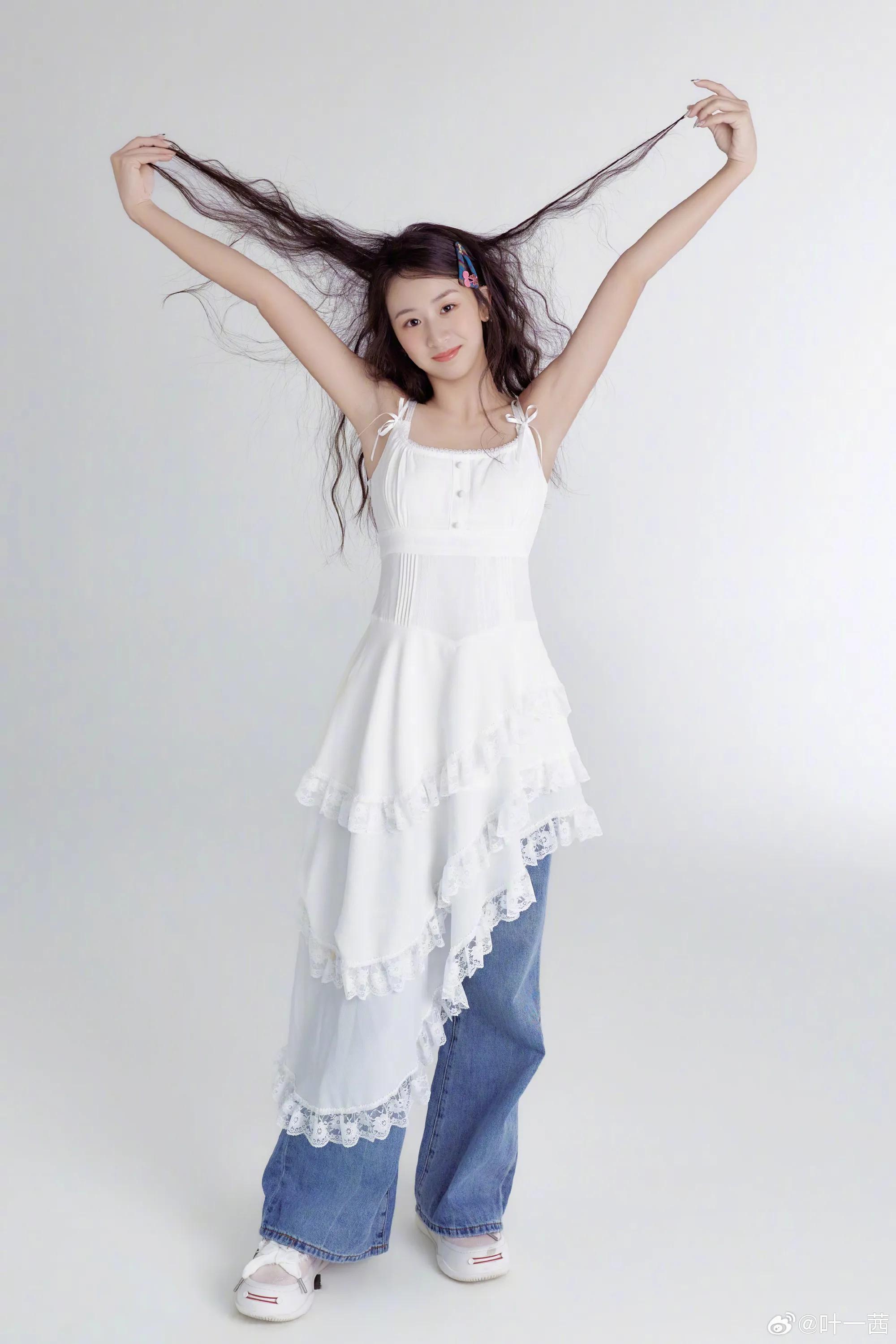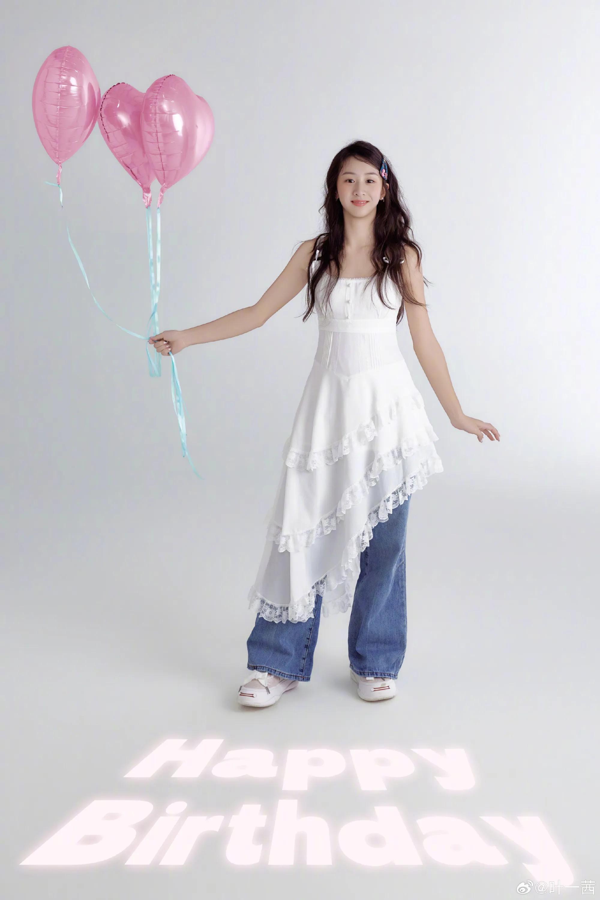 叶一茜晒出的是另外一套造型的写真,森蝶身穿白色连衣裙搭配牛仔裤,混搭风格就像森蝶本人一样甜酷少女感十足,充满青春活力。森蝶头戴粉色生日帽,或拿着气球,或对着蛋糕许愿,真的好欢乐。