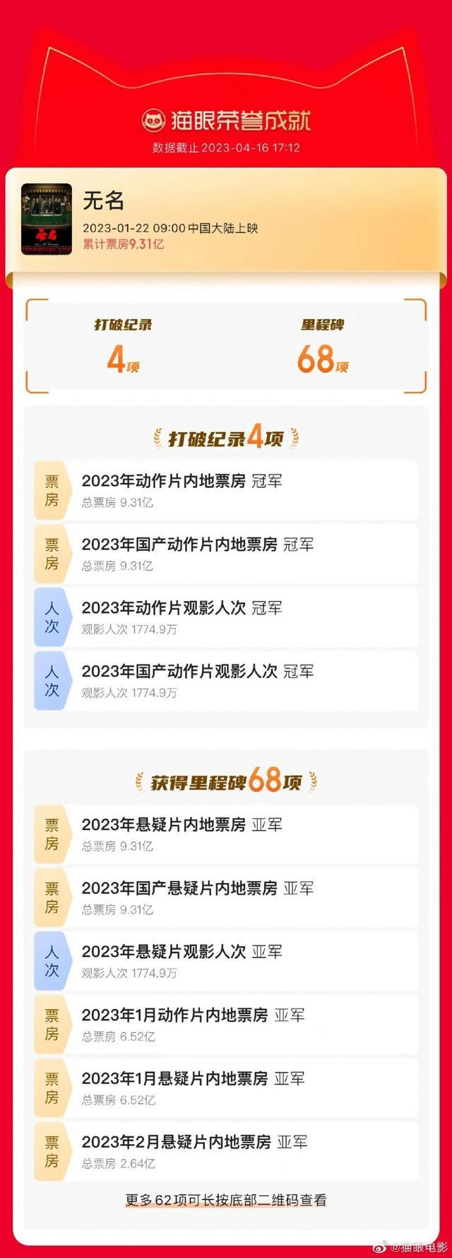 据猫眼电影统计,该片上映至今共打破4项纪录,获得68项里程碑,成为2023年动作电影票房观影人次双冠军。