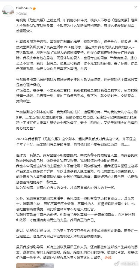 4月9日,孙俪通过个人微博发长文,首度正面回应其主演的都市悬疑剧《危险关系》收视率不及预期的争议,坦然面对收视低迷的现状,强调作品的社会意义远重于数据表现,引发网友及业内广泛讨论。