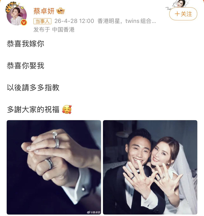 今天的热搜直接被蔡卓妍(阿Sa)的婚讯霸屏了!就在刚刚,阿Sa在微博上高甜官宣:“恭喜我嫁你。恭喜你娶我,以后请多多指教,多谢大家的祝福!”还晒出了美到失语的婚纱照和bling bling的钻戒!这波操作,简直是“猝不及防的糖,最为致命”!