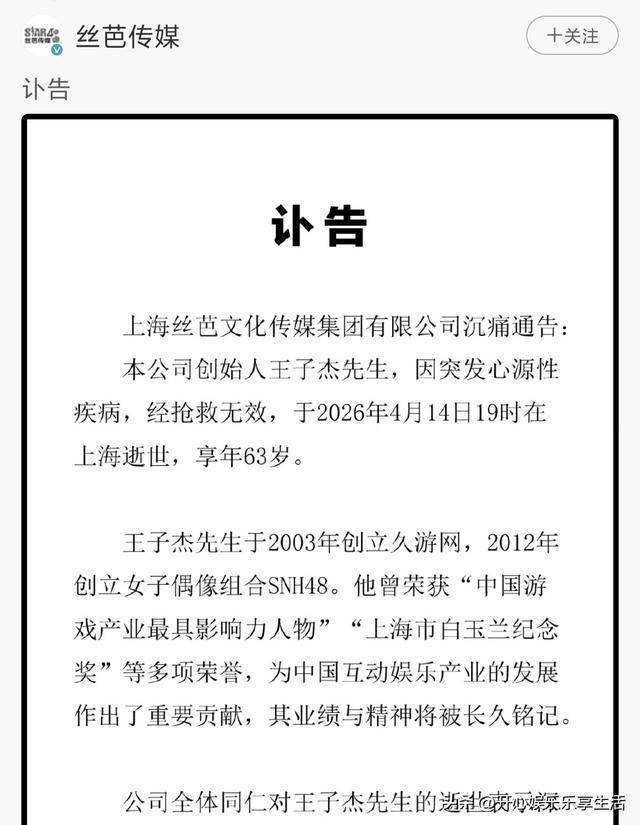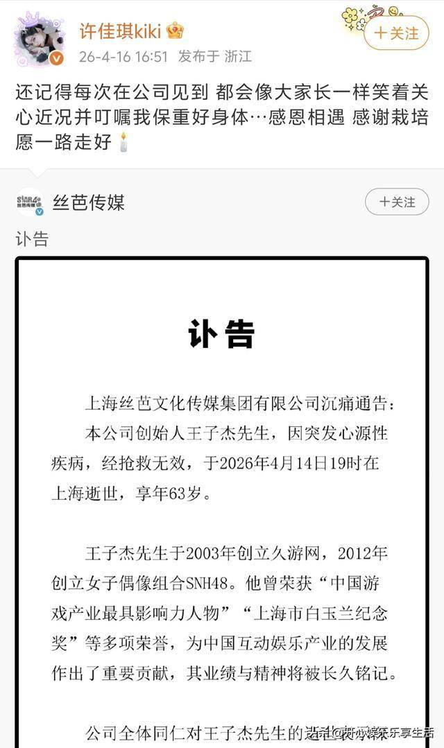 **吃瓜简评:丝芭总裁王子杰的“大家长”称号,真的是“大家”都给他捧上天了吗?**,2026年4月16日,丝芭传媒发布讣告,宣布王子杰因突发心源性疾病于4月14日去世,年仅50岁,消息一出,丝芭内外陷入了不同氛围的反响,丝芭旗下多位成员纷纷发文,称王子杰为“大家长”,这波操作让人不禁感叹:这位“内娱偶像教父”的“大家长”称号,真的是“大家”都给他捧上天了吗?,**从“大家长”到“魔鬼教父”:王子杰的双面性**,王子杰是SNH48的创始人,也是丝芭传媒的总裁,他的确为SNH48的崛起立下了汗马功劳,在2012年,他推出了“养成系”的运营模式,开创了剧场公演+总选投票的“本土化运营体系”,将许多艺人捧红,甚至被誉为“内娱偶像教父”,丝芭的“魔鬼合约”和天价赔偿金也让他成为争议的焦点,被外界批评为“黑心吸血之徒”。,但不可否认的是,在SNH48初期,王子杰对成员的关怀和管理确实给人留下了深刻的印象,他曾公开承诺要“杜绝任何黑幕和潜规则”,并严惩成员的私联行为,这些举措在当时被认为是对明星管理的革新,随着公司的发展,王子杰的管理风格也逐渐暴露出了问题,尤其是在成员培训、分成计算以及健康管理方面,常常被批评为过于严苛。,**“大家长”的称号背后:成员们的感恩与矛盾**,尽管王子杰的管理方式引发了不少争议,但也有不少丝芭成员在他的离世后发文感恩,许佳琪、莫寒、吴哲晗等人纷纷表示,王子杰曾给予他们重要的机会,让他们从SNH48的训练场上走到舞台的另一端,许佳琪在发文中回忆了王子杰关心她的过去,称他为“大家长”,并感慨“再也无法复刻的青春岁月”,莫寒则表示,王子杰让她得以遇到喜欢她的粉丝,也成就了她现在的演艺生涯。,但有趣的是,这些发文的成员在过去的经历中并非完全和谐,比如吴哲晗曾因“私联粉丝”被王子杰当众降格为四期生,这堪称是SNH48时代的“典型案例”,吴哲晗在发文中却表示对王子杰的感激,称他为“大家长”,并回顾了当初不成熟的自己,对王子杰的栽培感到感激。,**“大家”为何发声?:发文背后的真相**,这些发文背后可能隐藏着多重因素,王子杰的去世让大家对他过去的贡献有了新的反思,对于曾经与他有过矛盾的成员来说,这或许是一种情感的宣泄和释怀,丝芭传媒作为一个有着复杂内部关系的公司,成员们发声可能也带有一定的策略性,也许他们希望通过表达对王子杰的感恩,转移公众对公司管理问题的关注。,更重要的是,这些发文可能也反映了成员们对王子杰个人的一些情感变化,毕竟,王子杰在SNH48的初期确实为他们铺平了道路,让他们有了今天的成名之路,即使在后来的管理中存在争议,王子杰的“大家长”称号也让人不禁感叹:他是否真的是“大家”眼中的“大家长”,还是“大家”为了某种原因而捧上天的“偶像”。,**王子杰的“大家长”称号,终究是一个充满矛盾的话题**,王子杰的去世让“大家”们重新审视了他的形象,无论是对他在SNH48初期的贡献,还是对后期管理风格的批评,王子杰都留下了深刻的印象,成员们发文感恩,或许是对他个人的一种安慰,也或许是对“大家长”这个称号的一种延续,这个称号背后,依然隐藏着太多的矛盾与复杂,或许,王子杰的故事提醒我们,在明星背后,总有一个复杂的个体,而我们对他们的评价,终究是多元的。,在这个充满戏剧性的娱乐圈里,王子杰的“大家长”称号,终究是一个让人唏嘘的话题,他的去世或许让我们对他的复杂面具有了更深的理解,但对于“大家”或许这只是一个情感的宣泄与释怀,无论如何,王子杰的故事,终将成为SNH48、丝芭传媒,乃至整个娱乐圈的一部分传奇。